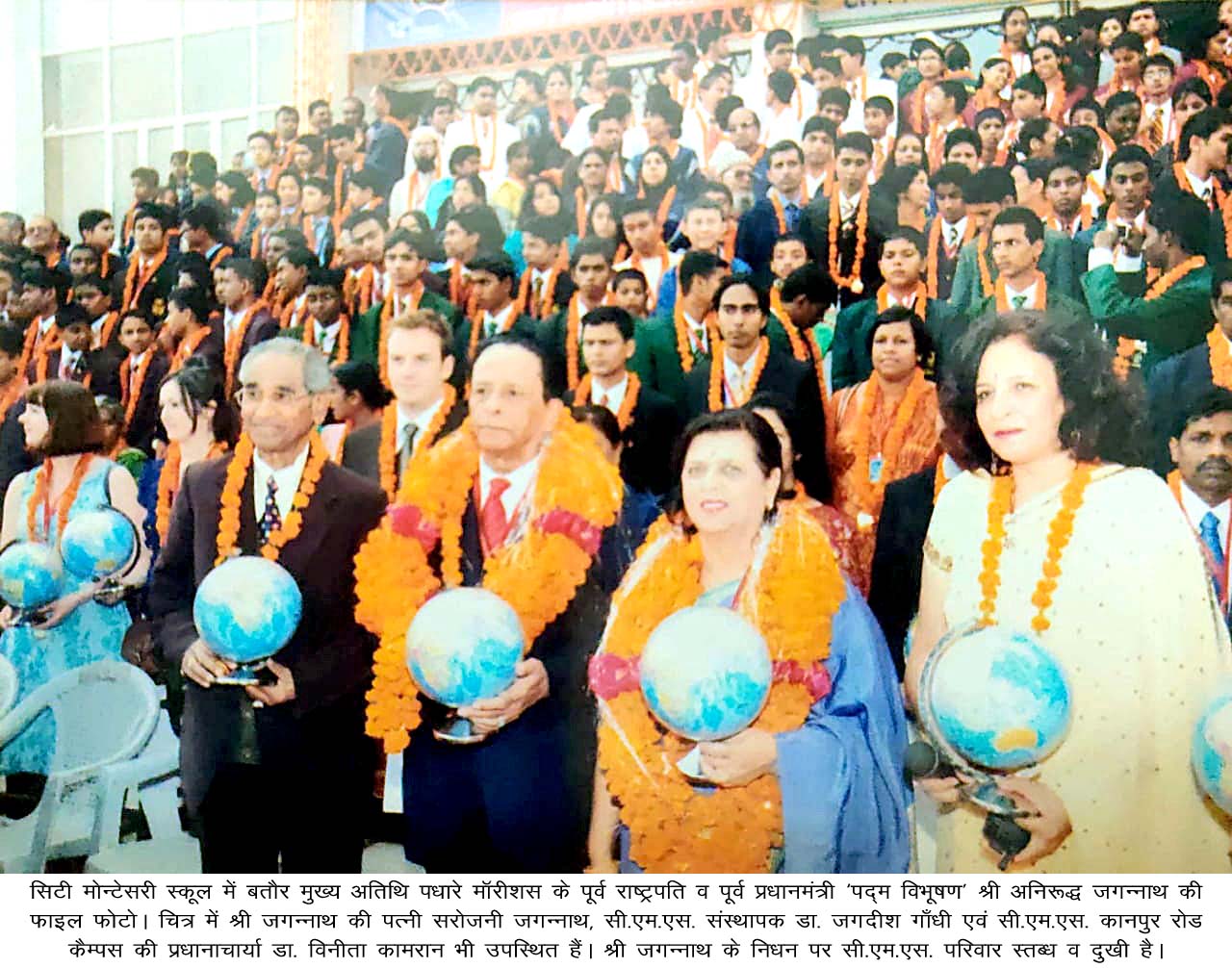 लखनऊ, 5 जून। भारतीय मूल के मॉरीशस के पूर्व राष्ट्रपति और पूर्व प्रधानमंत्री ‘पद्म विभूषण’ अनिरूद्ध जगन्नाथ के निधन पर सिटी मोन्टेसरी स्कूल परिवार में शोक की लहर दौड़ गई। अनिरूद्ध जगन्नाथ सी.एम.एस. के आमंत्रण पर तीन बार विद्यालय द्वारा आयोजित अंतर्राष्ट्रीय समारोह में मुख्य अतिथि के रूप में लखनऊ पधार चुके हैं। वे दो बार सी.एम.एस. कानपुर रोड द्वारा आयोजित अन्तर्राष्ट्रीय स्टूडेन्ट क्वालिटी कन्ट्रोल सर्किल सम्मेलन में मुख्य अतिथि के रूप में तथा एक बार विश्व के मुख्य न्यायाधीशों के अंतर्राष्ट्रीय सम्मेलन में प्रतिभाग करने सी.एम.एस. आ चुके हैं। सी.एम.एस. संस्थापक डा. जगदीश गाँधी व डा. भारती गाँधी, सी.एम.एस. प्रेसीडेन्ट व एम.डी. डा. गीता गांधी किंगडन  एवं सी.एम.एस. कानपुर रोड कैम्पस की प्रधानाचार्या डा. विनीता कामरान ने उनके निधन पर शोक व्यक्त करते हुए इसे संस्था के लिए निजी एवं अपूर्णीय क्षति बताया है। उक्त जानकारी सिटी मोन्टेसरी स्कूल के मुख्य जन-सम्पर्क अधिकारी हरि ओम शर्मा ने दी।