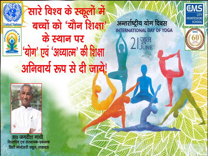 यह हमारे लिए बहुत सौभाग्य की बात है। 27 सितम्बर 2014 को माननीय प्रधानमंत्री श्री नरेन्द्र मोदी जी द्वारा संयुक्त राष्ट्र संघ में अंतर्राष्ट्रीय योग दिवस मनाने के लिए दिए गए प्रस्ताव को 177 देशों ने अत्यंत सीमित समय में पारित कर दिया था। संयुक्त राष्ट्र संघ ने 21 जून को अंतर्राष्ट्रीय योग दिवस घोषित किया। वर्ष 2015 से प्रतिवर्ष 21 जून को विश्व के सभी देशों द्वारा इस योग दिवस को पूरे उत्साह के साथ मनाया जाता है। सिटी मोन्टेसरी स्कूल के 60 से 70 छात्र प्रतिवर्ष संयुक्त राष्ट्र संघ के मुख्यालय न्यूयार्क में जाकर अंतर्राष्ट्रीय योग दिवस 21 जून को योग का प्रदर्शन करके भारत का गौरव बढ़ा रहे हैं।