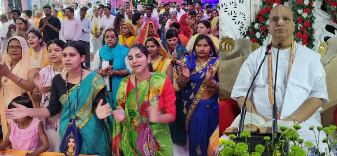लखनऊ :इस्कॉन मन्दिर, सुशांत गोल्फ सिटी, अंसल, लखनऊ में सात दिवसीय श्रीमद भागवतम कथा के तृतीय दिवस इस्कॉन जोनल सेक्रेटरी आदरणीय श्रीमान देवकीनंदन प्रभु जी एवं लखनऊ मंदिर के अध्यक्ष आदरणीय श्रीमान अपरिमेय श्याम प्रभु जी ने दीप प्रज्जवलित कर कथा का शुभारम्भ किया l आज कि कथा मे इस्कॉन जोनल सेक्रेटरी आदरणीय श्रीमान देवकीनंदन प्रभु जी ने बताया कि हमें एकाग्रचित्त एवं आलस्य रहित होकर भगवान की सेवा करनी चाहिए श्रीमद भागवतम के आठवें स्कन्ध के अठारहवे अध्याय मे बताया गया कि गुरु और साधु प्रसन्न रहेंगे तो भगवान प्रसन्न रहेंगे इसलिए हमें सदैव गुरु और साधु कि प्रसन्नता का ध्यान रखना चाहिए l इसी अध्याय मे भगवान के उपनयन संस्कार का वर्णन किया गया है, जिसे बहुत ही रोचक तरीके प्रस्तुत किया गया l बलि महराज भी भगवान को उपहार देना चाहते थे lउपस्थित भक्तों ने इस्कॉन के उल्लासमयी कीर्तन एवं नृत्य का आनंद लिया l कथा के उपरांत लखनऊ शहर एवं आस – पास से आये सैकड़ो भक्तों ने भोजन प्रसाद भंडारा का आनंद उठाया l