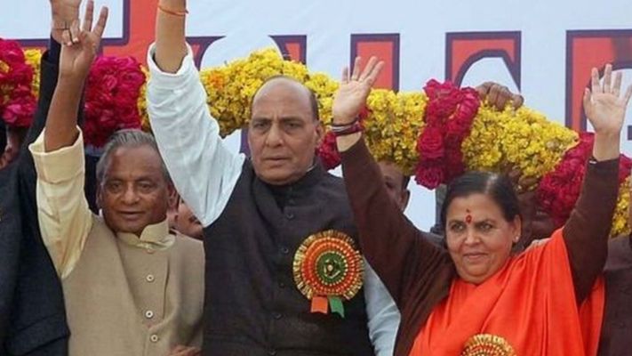 बीजेपी नेता कल्याण सिंह के साथ पूर्व प्रधानमंत्री अटल बिहारी वाजपेयी और प्रमोद महाजन